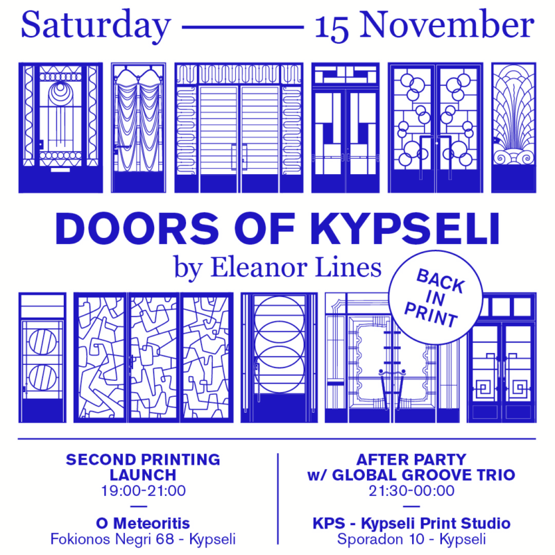 On Saturday, November 15, Kypseli Print Studio, O Meteoritis and Hyper Hypo are delighted to invite you to the much anticipated launch of the second printing of Doors of Kypseli by Eleanor Lines. The, by now, famous blue doors are back out on these streets and making a splash in the neighborhood they came from.