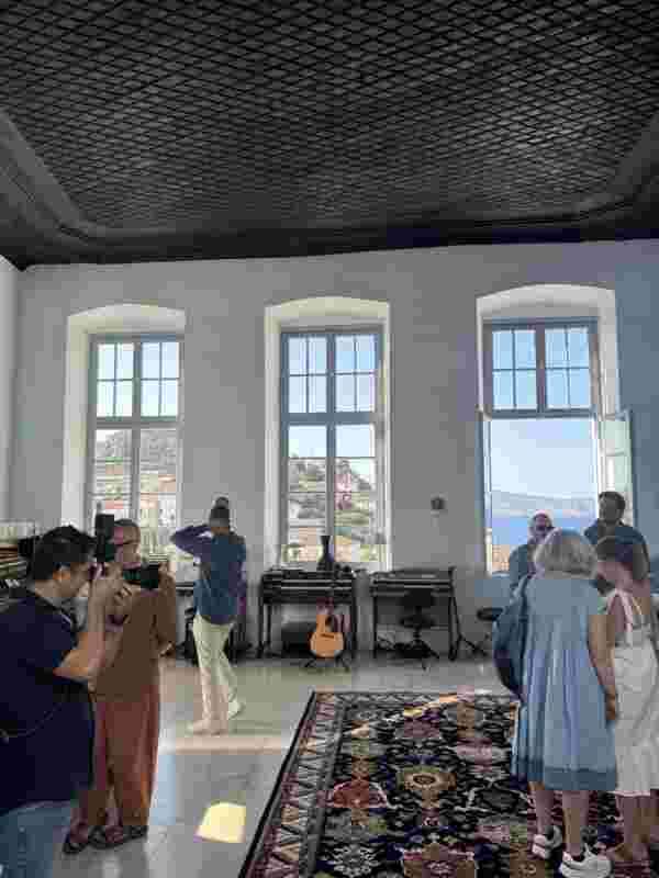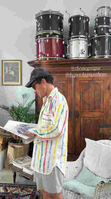 Peppered with homages to cultural icons who were struck by Hydra’s mystique and on whose work the island in turn left an impression — from Ghikas to Henry Miller, Leonard Cohen and Patrick Leigh Fermor — combining wit with sentiment, vibrant colors with raw, energetic lines.