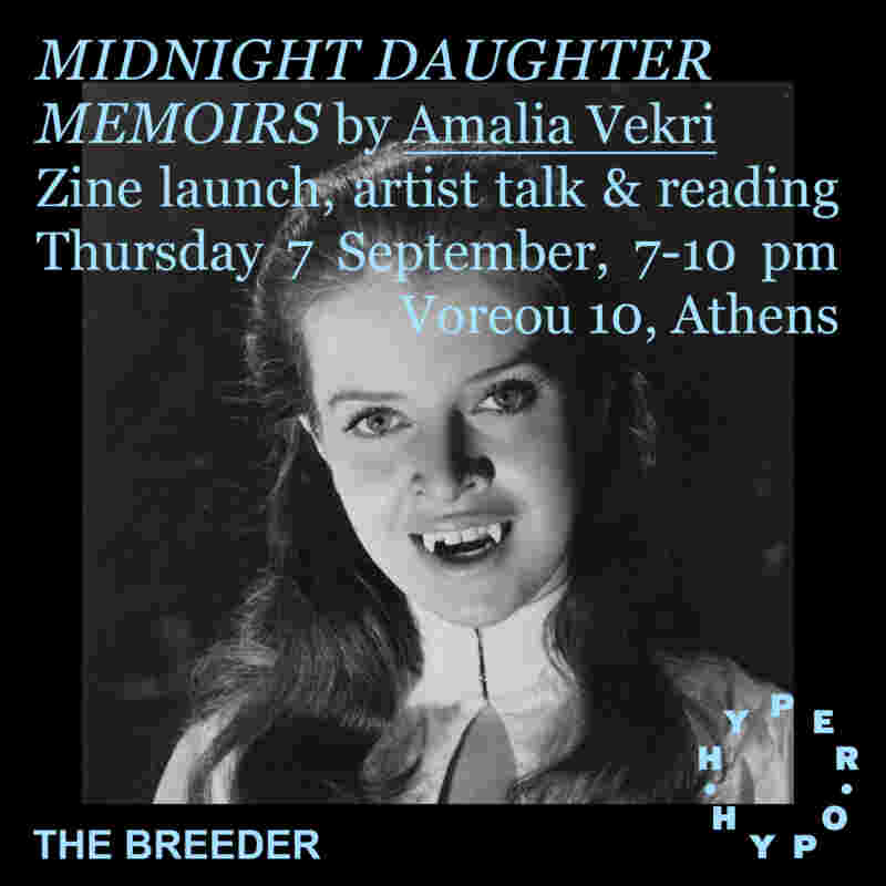 Hyper Hypo and The Breeder gallery are pleased to invite you to a very special evening into the vampiric erotic fantasy of artist Amalia Vekri, with the launch of her new publication, Midnight Daughter Memoirs. On the heels of her recent exhibition at The Breeder, Amalia bites into the under-explored lore of female vampires via her own texts, found images, and her most recent works, in this newest zine published by Hyper Hypo. Come by for your chance at immortality, this Thursday, September 7th, from 7pm for the launch of the zine, with readings and conversation with the artist.